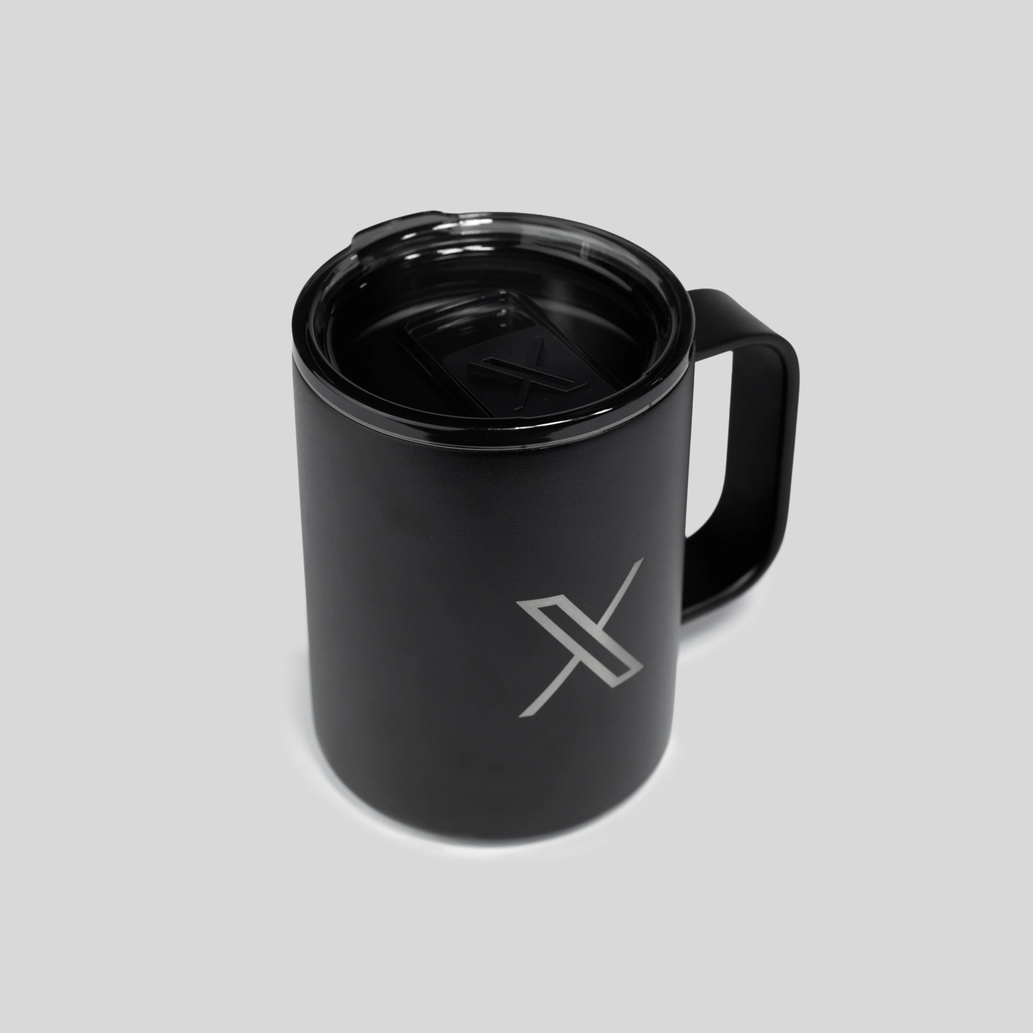 The Everything Mug is a premium, 10 oz thermal-insulated travel mug built for everyday use at home, in the office, or on the go. It is crafted from durable powder-coated stainless steel and finished with an engraved X logo for a clean, elevated look. The mug comes with an anti-slip silicone foot and the lid features a splash-resistant X branded slider.